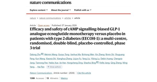 HANGZHOU, China, Jan. 28, 2026 /PRNewswire/ — Recently, the results of the pivotal Phase III clinical trial (EECOH-1) of ecnoglutide injection, developed by Sciwind Biosciences Co., Ltd. (“Sciwind”), for the monotherapy of type 2 diabetes (T2DM), have been published in Nature…